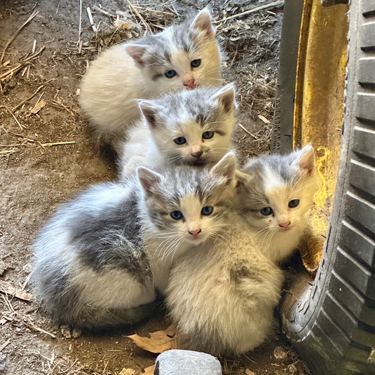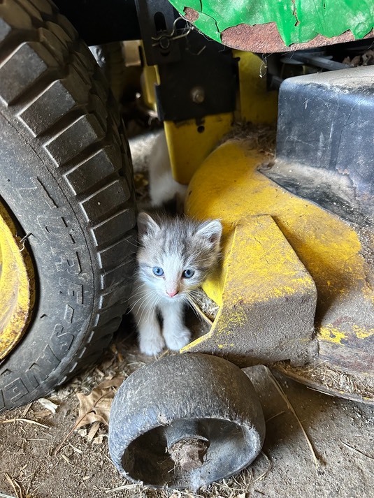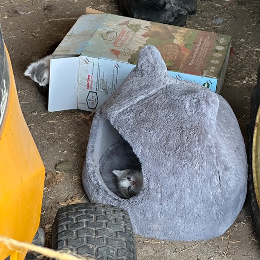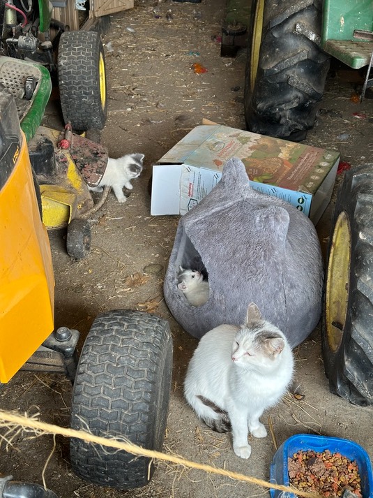 But last afternoon, she moved the kittens to the cat garage. Here’s a video of her nursing them by the tractor wheel (more after the video):