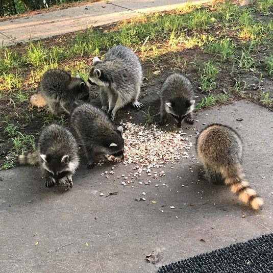 Mother raccoon has her 5 babies at the peanut pile in East Moline!