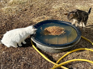 Luna and Marbles are befuddled as to why the mealworms were piled in the middle of the ice where they can’t reach it. 😾