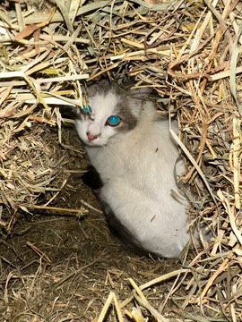 “I’m so happy I get to say good morning to YOU! Didn’t the flash bulb give me blue eyes? You can explore all sorts of little tunnels in the hay (and maybe find a mouse or two 🐭).”