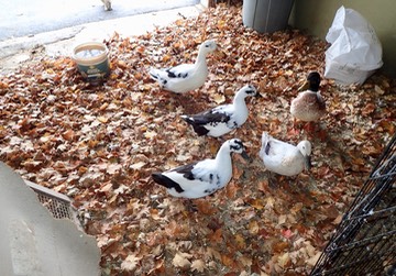 The ducks don’t need sawdust today. . .The wind has blown in a nice carpet of leaves.