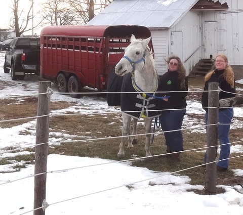 Here’s Stormy saying goodbye before Mara and Mary put him in the trailer. Since our truck is in the shop, we were so grateful that our friends Barb and Brian took him to Galva in their equipment: