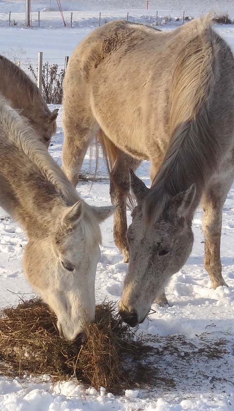 His grayness must remind her of her son. Here they are this morning eating side-by-side. 🐎