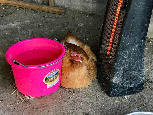 It’s just Hansel, trying to get his feet toasty! 🐓