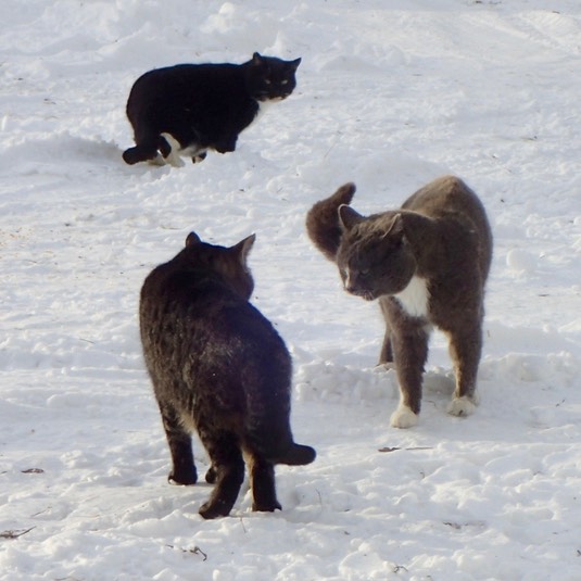 Here’s a little sparrow in the snow. It looks lonely, but a second ago it was surrounded by friends. They all flew away when a cat-cop walked up to take a picture. What a smart bird! It knows the people at this farm are nothing to fear (cats are another story). “They flew off and left all this food to me.”