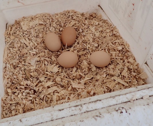 A hen has laid her morning complement of eggs: