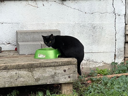 Gray-stray is having breakfast at the raccoon pile. Don’t feel too bad for him, because the food is still pretty fresh, and it’s warm (it spent the night in the tack room):