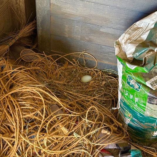 Well, hello chicken. You’ve found a novel place to lay your egg: