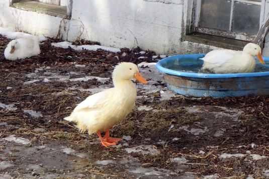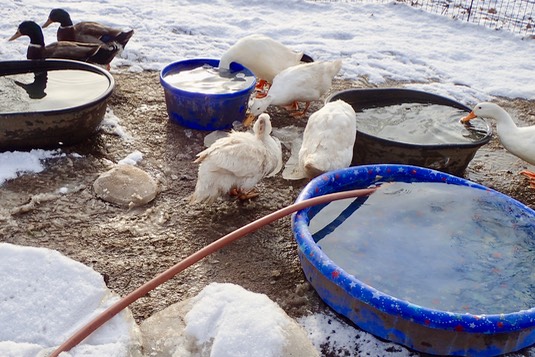 The tubs are frozen this morning, so the ducks have fresh water in buckets: