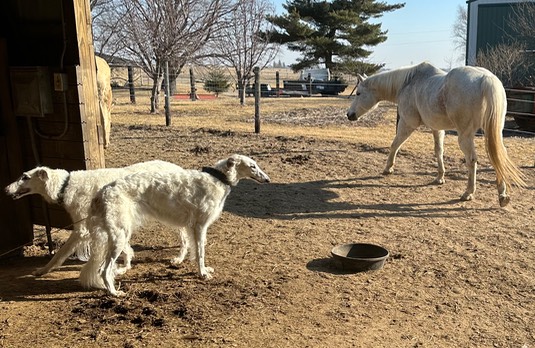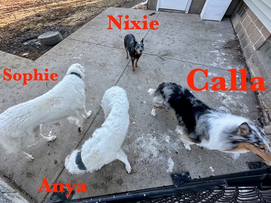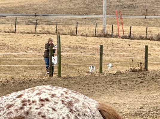 And I see Patches and Luna are helping Ann look for litter in the front pasture."