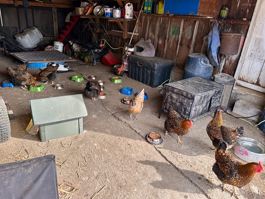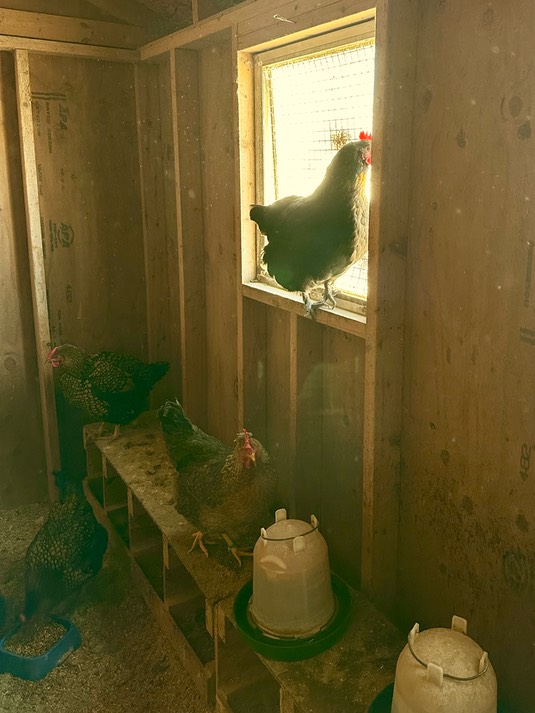 Don’t worry, chickens, you’ll get let out as soon as the cats finish breakfast (as you know, the chickens love cat food more than the cats do):