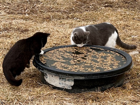 Luna and Marbles are befuddled as to why the mealworms were piled in the middle of the ice where they can’t reach it. 😾