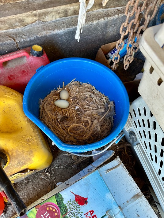 “The chickens have two perfectly good, clean coops. Yet, they chose to lay two (of the five) in this bucket in the cat—our—garage.”