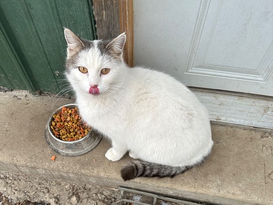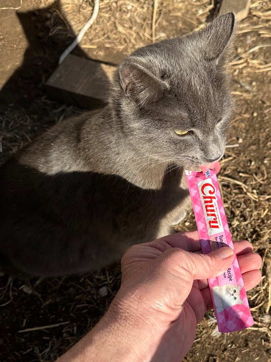 Good morning! Rose is helping me hurry up breakfast, as she’s tall enough to reach over the wall and give the cat-cops a nudge: