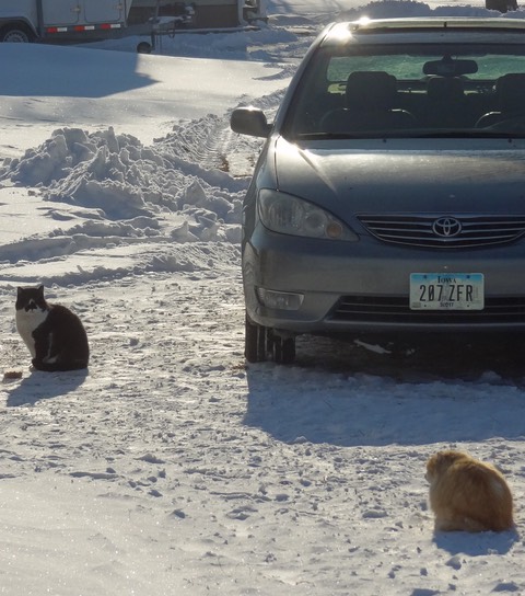 —big time. 🙀 I think they both felt like the dog that finally caught the car. Tux already has an ear that has been shortened by battle and Luigi left it bleeding again. For a while we thought Luigi got the worst of the grapple because he hid under the car for a while and coughed, but he’s ok. Tux vacated the premises for the day, but it appears he at least walked away with two eyes and four paws.