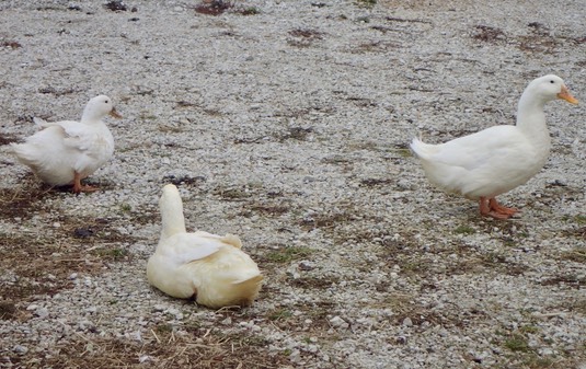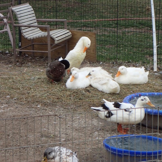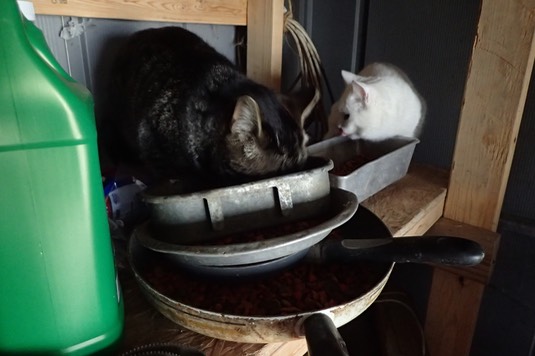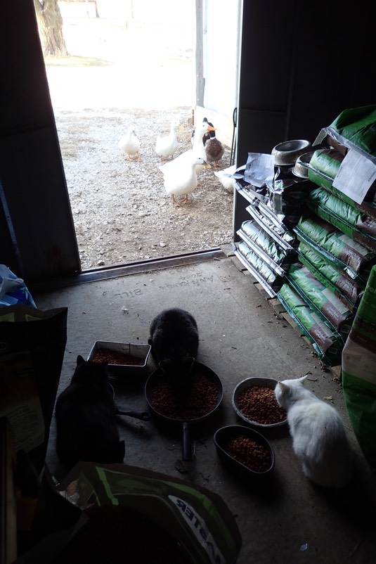 The cats are eating in the feed shed while the ducks lurk outside (as you know, they love cat food):