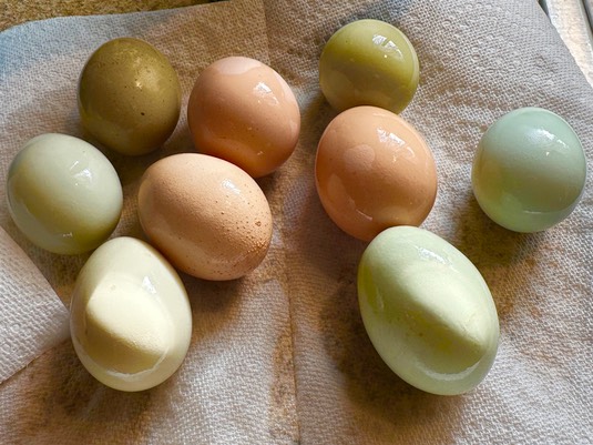 With the Faverolles and Wyandottes laying brown eggs, the olive-eggers laying green eggs, and the Easter-eggers laying blue and turquoise eggs—every day on the farm is an egg hunt! 🥚