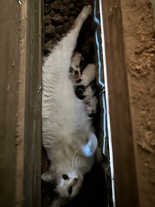 First, let’s take a peek at the baby kitties (Momma Tails will be right back to feed them, after she grabs a quick bite of breakfast for herself):