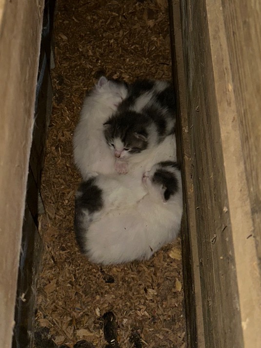 The kittens are huddling together, keeping warm while Momma eats breakfast. She won’t be gone long: