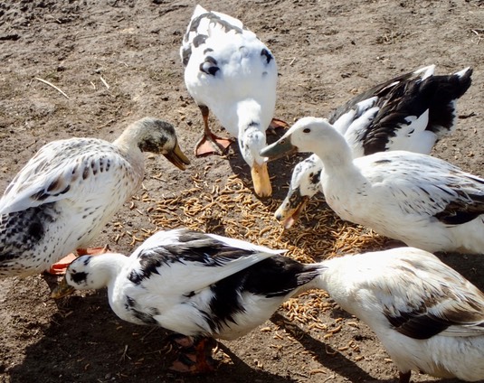 The pekins, all nice and clean, have mealworms after their bath.