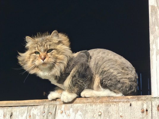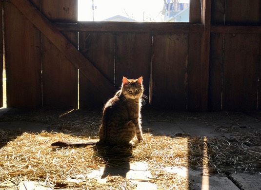 The wind was terrible yesterday afternoon. Here’s Evil Cat, on the door that blew off the hay barn:
