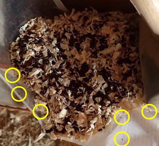 The little dots in the yellow circles below are “fly predators” as they hatch. They will fly away, land on our poopies, and stop the flies by laying eggs on their larvae:
