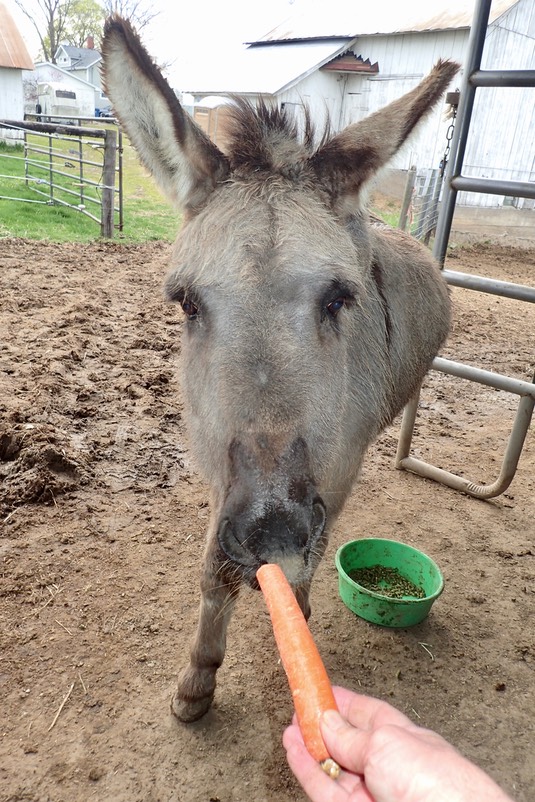 I’ve been spending all day in the far pasture, munching down the new grass, which is high in starch and sugar, which can cause horses and donkeys stomach and hoof problems if we get too much of it: