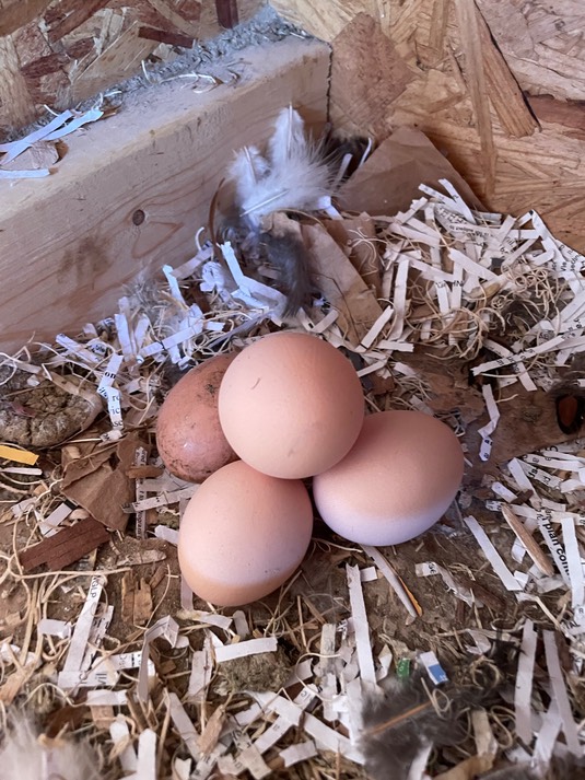 Petra says, “Good morning! We have 3 eggs already this morning, and will have many more by this afternoon. We lay at least a dozen a day!”