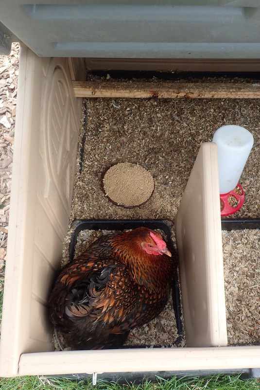 This hen has discovered that the chicks’ coop is a nice, private place to lay an egg: