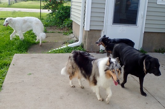 Alfred, Onslow and Schrödinger are hanging around the back door of the farm house: