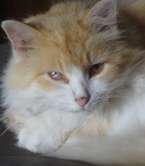 The last time we saw him he could not use his front left leg, but now it’s better. You’ll notice he has a lot of hair missing on his face. He really needs to stay out of fights.