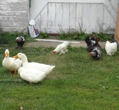 She also upped her egg count by 1 normal-sizer this morning, so the chickens:duck score is now 5:4. But please don’t tell her that we broke her egg, or that we—