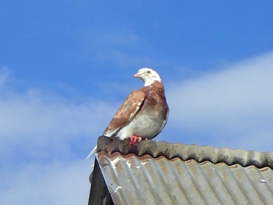 Oh, and for the past week, we’ve had a pigeon hanging around the farm. It’s either a homing or racing pigeon, because it has a foot band.