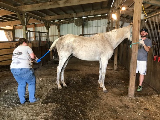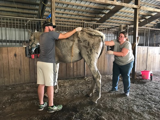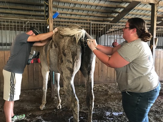 Here’s Mary injecting the abscess with iodine to help clear out the infection. Bill has to hold his tail tightly, to keep him from kicking.
