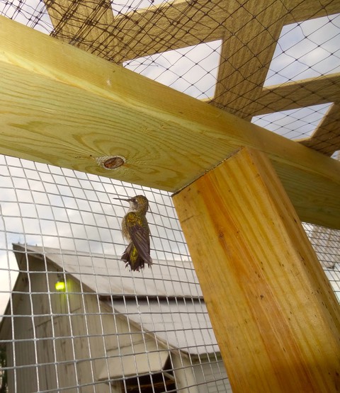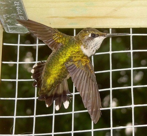 A juvenile hummingbird got trapped in the duck and hen pen:
