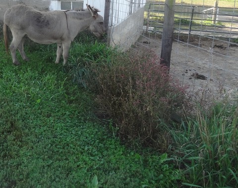 He wandered onto the farm (or was dropped off) and shows no sign of leaving. He is very people-friendly (which means very soon he’ll be going to the you-know-where to get you-know-what-ed). Here he is fitting right in at breakfast: