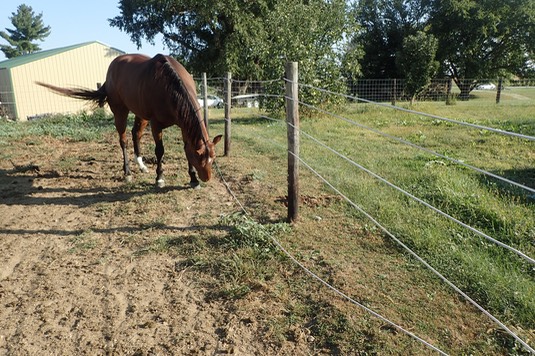 Jewel just can’t keep her hooves off that lower fence wire. Notice that the bottom wire is on the ground: