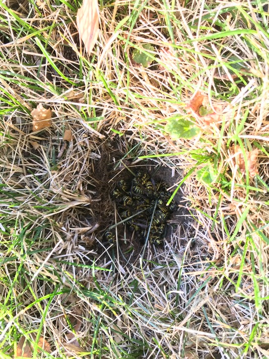 Now, this looks like an innocent hole in the ground, and while you can’t tell it from this picture—believe us!—it’s swarming with aggressive hornets!