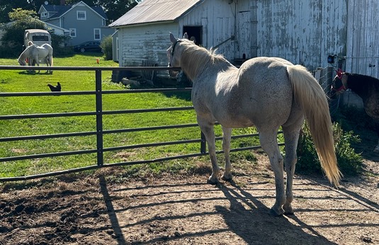 Indira is waiting for Chezzie to leave his stall, so she can have his leftovers: