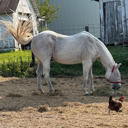 But she only does it after breakfast before joining us outside. And since our dear Misty is about 35 years old, it can’t be too bad for her. 🐎