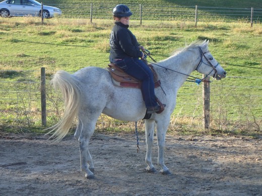 Finn is back from the vet, but she has to stay in the tac room for a day or so. Here I am, a couple days ago, giving her a ride: