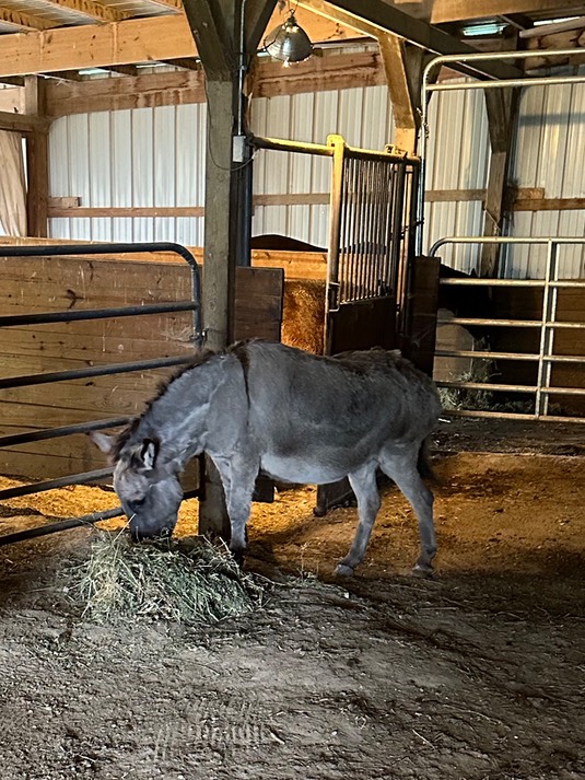 We’re having hay inside. Stormy is helping his mother finish her breakfast: