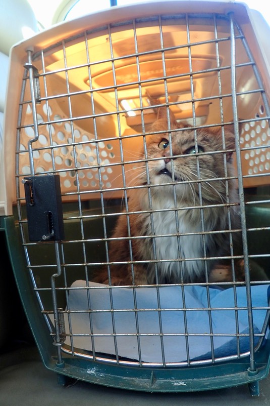Finally, our Buttons was limping! Ann examined her, and thinks some bad kitty bit her in a fight, and the bite became infected! Her right front leg was tender and swollen; so, off to the vet she goes!