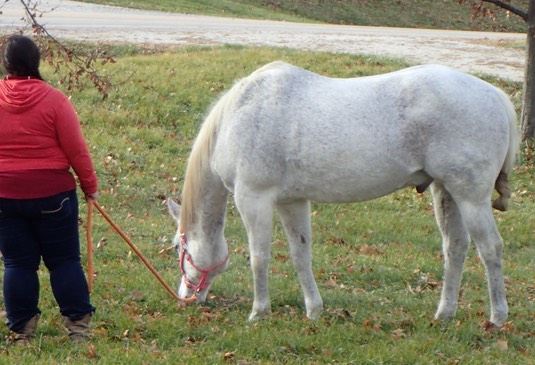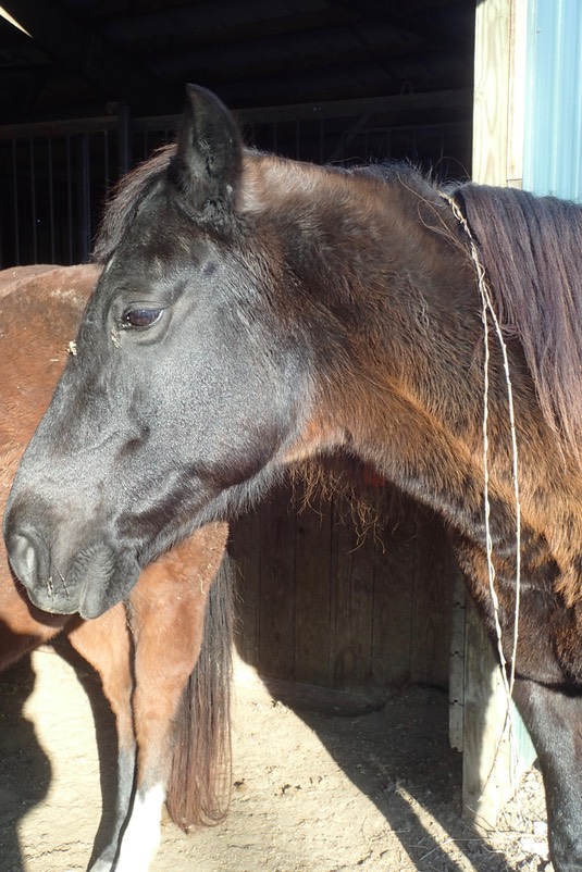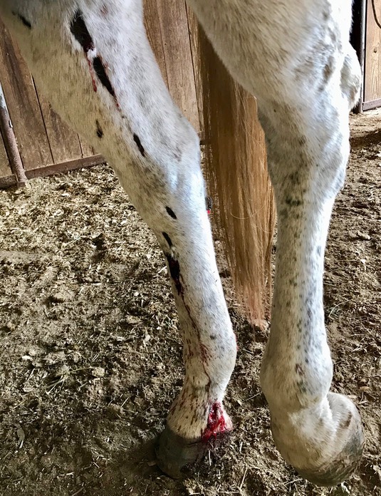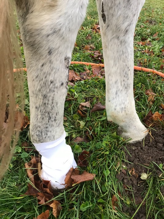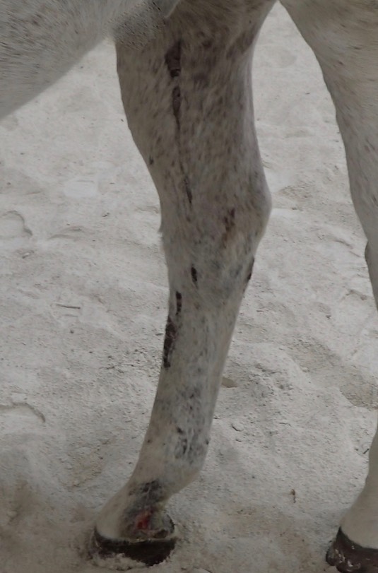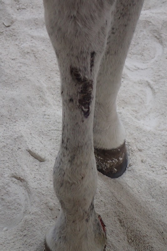 A place above Stormy’s rear right hoof still hasn’t healed: