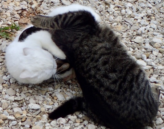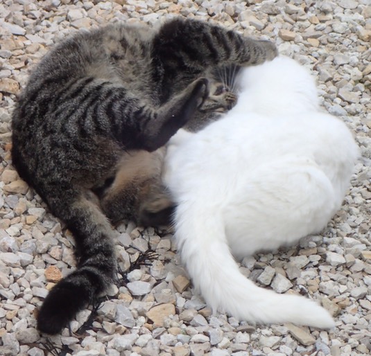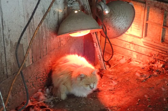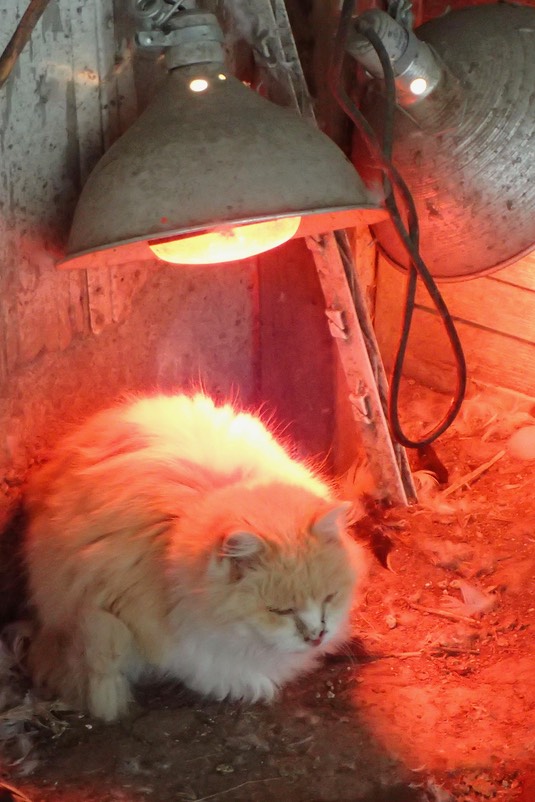 And the roosters horn-in on the cats’ breakfast. Hansel and Baldy love canned cat food! 🐓