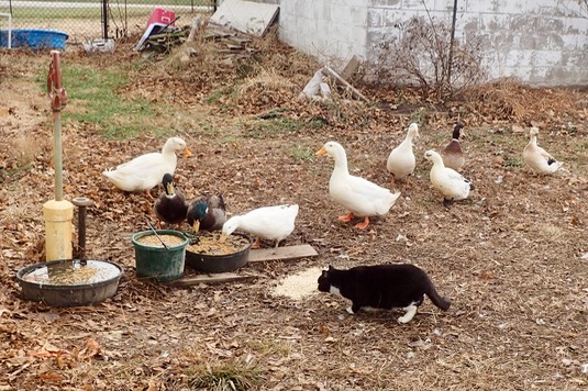 Iris is staying cozy, under the hay barn, with the ducks: