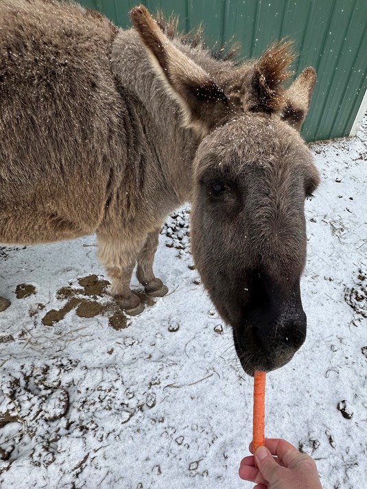 Iris says, “Good morning! I’ll have a carrot, too, please. Don’t worry about the snow on my back, it’s not cold enough to bother me.”