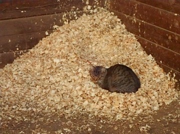 Finn decides it’s a good day to stay in bed (in this case, “bed” is a pile of wood chips in Iris’s stall). 😺