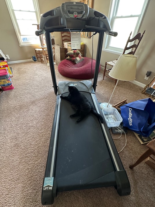 I don’t think laying on the treadmill qualifies as exercise, Tyrus. Anyway, when Ann gives us all a good brushing, there’s more hair in the cart than poopies!
