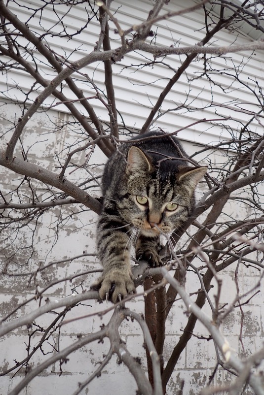 Then he climbs the tree by the garage:
